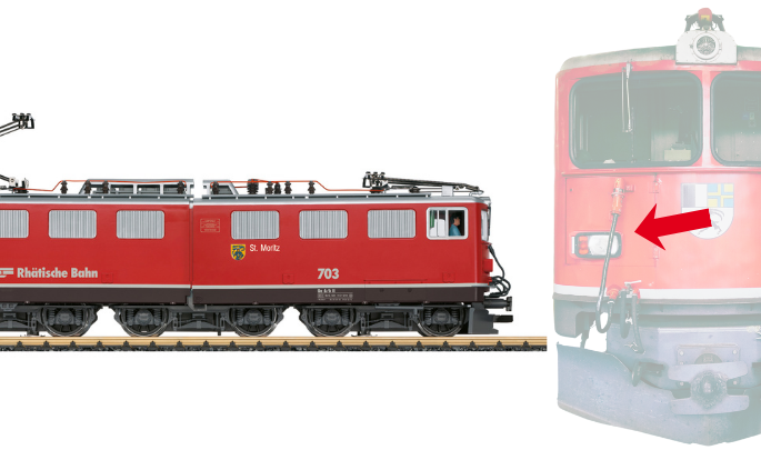 Die sogenannte Bo´Bo´Bo´der RhB (Achsfolge) wurde im Vorbild mehrfach in einigen Details umgebaut und den jeweils aktuellen Bedürfnissen des Einsatzes udn der Unterhaltung angepasst. So wurden auch die Scheinwerfer an den Fronten nach und nach auf die rechteckige Version umgebaut. Das LGB Modell der Nr. 703 erhält nun ebenfalls diesen Umbau unerscheint nun mit der "ReFit" genannten Front.